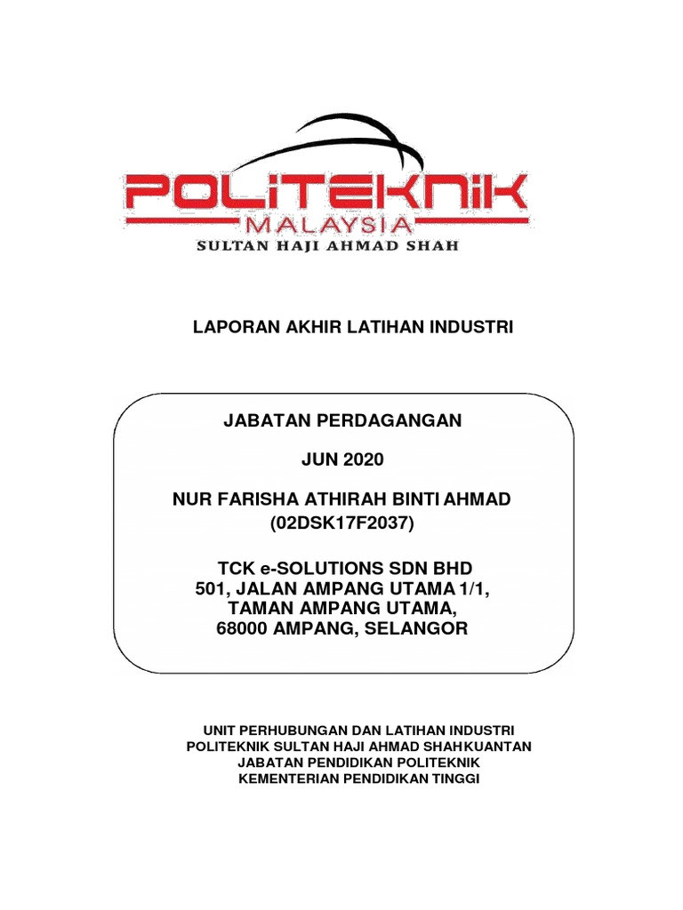 Tehah27 laporan latihan industri bab 1 2 3. Contoh laporan latihan industri full. Politeknik sultan azlan shah behrang perak kursus.
